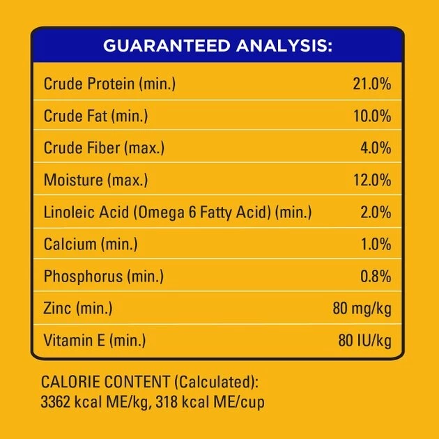Ground Whole Grain Corn, Meat And Bone Meal, Soybean Meal, Corn Gluten Meal, Animal Fat (Source Of Omega 6 Fatty Acids[Preserved With BHA & Citric Acid]), Natural Flavor, Dried Plain Beet Pulp, Salt, Potassium Chloride, Cooked Bone Marrow, Choline Chloride, Calcium Carbonate, Dried Peas, DL-Methionine, Natural Grilled Steak Flavor, Zinc Sulfate, Yellow 6, Vitamin E Supplement, L-Tryptophan, Yellow 5, Red 40, Dried Carrots, Blue 2, Niacin Supplement (Vitamin B3), Copper Sulfate, Sodium Selenite, Potassium Iodide, D-Calcium Pantothenate (Source Of Vitamin B5), Vitamin A Supplement, Riboflavin Supplement [Vitamin B2], Vitamin B12 Supplement, Thiamine Mononitrate (Vitamin B1), Vitamin D3 Supplement, Pyridoxine Hydrochloride (Vitamin B6), Folic Acid