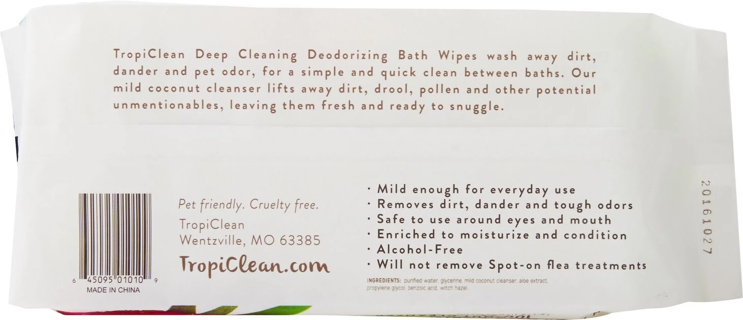Keep your pet clean and fresh between baths with TropiClean Deep Cleaning Deodorizing Dogs Wipes. While baths are an important part of your pet’s grooming routine, bathing too often can dry and irritate skin. TropiClean Deep Cleaning Deodorizing Dogs Wipes washes away dirt and dander and eliminates odor for a simple and quick clean between baths. Made with a mild coconut cleanser, it lifts away dirt, drool, pollen and more, leaving your pet clean and fresh.