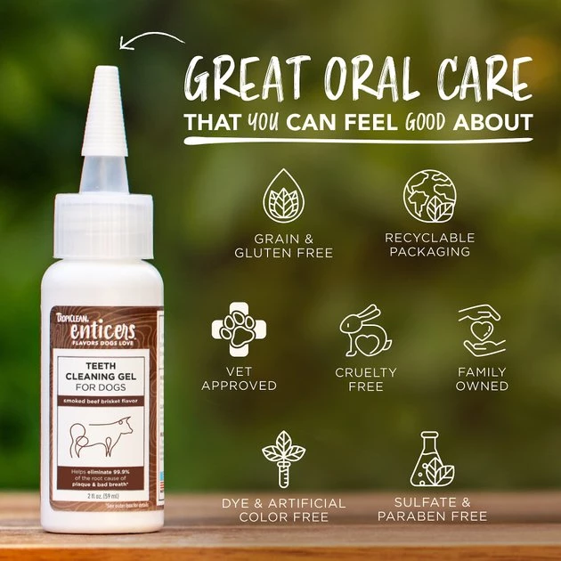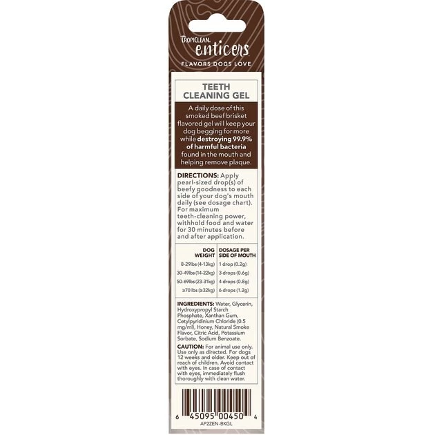 Make dental care a delicacy with TropiClean Enticers Smoked Beef Brisket Flavor Teeth Cleaning Dog Dental Gel. This drool-worthy gel features a smoked beef brisket flavor your dog will adore. Tropiclean Enticers are formulated to help destroy the harmful mouth bacteria that causes bad breath and plaque for sparkly clean teeth. And best of all, the gel works as your dog licks and smacks his lips—no brushing required!