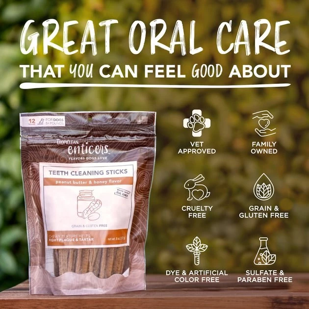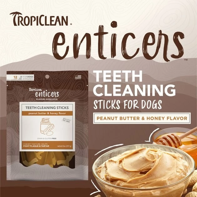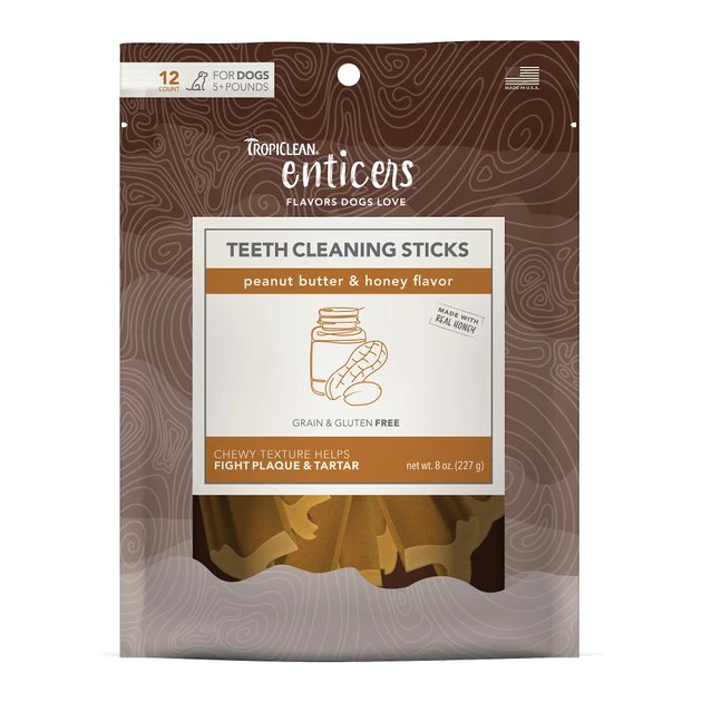 Your pal can brush his teeth with every bite of a TropiClean Enticers Sticks Peanut Butter & Honey Flavor Teeth Cleaning Dog Dental Treat. This delectable dental treat features a brush-like texture that helps fight plaque and tartar as your dog chews. It also comes with a drool-worthy peanut butter and honey flavor that will have him begging for more! Each stick is made with naturally derived ingredients and real bacon. Just one stick per day offers the meaty goodness he craves in a teeth-cleaning treat you’ll love!