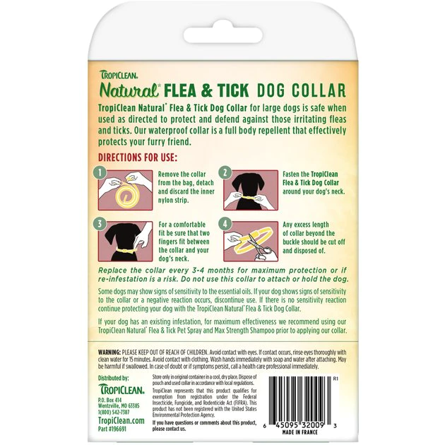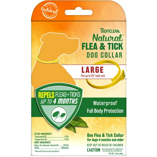 Keep those pests off of your furry friend with TropiClean Flea & Tick Repellent Collar for Large Dogs. This collar repels and defends against fleas and ticks for up to four months. It is made with natural active ingredients like cedarwood and peppermint oils to develop a full body repellent for dogs. This collar is also waterproof so it can withstand outdoor play and baths. Safe for pups four months of age and older, TropiClean Flea & Tick Repellent Collar will keep your paw-tner free of irritating insects.