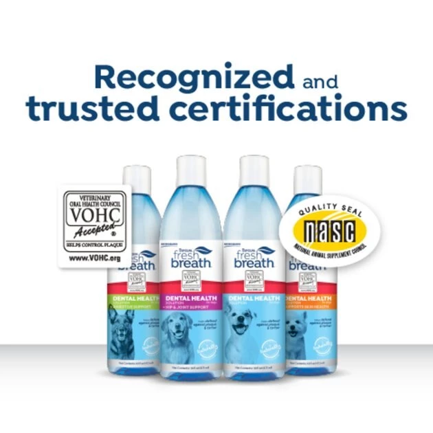 Add a half capful of this tasteless and odorless no-brushing solution to your dog’s 8oz water bowl twice daily. Use in combination with Fresh Breath Certified Wellness Collection clean teeth gel as part of your dog’s daily dental care regimen.