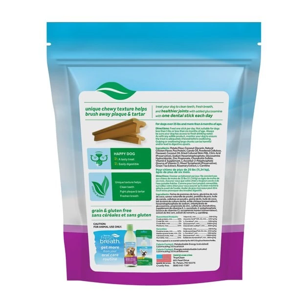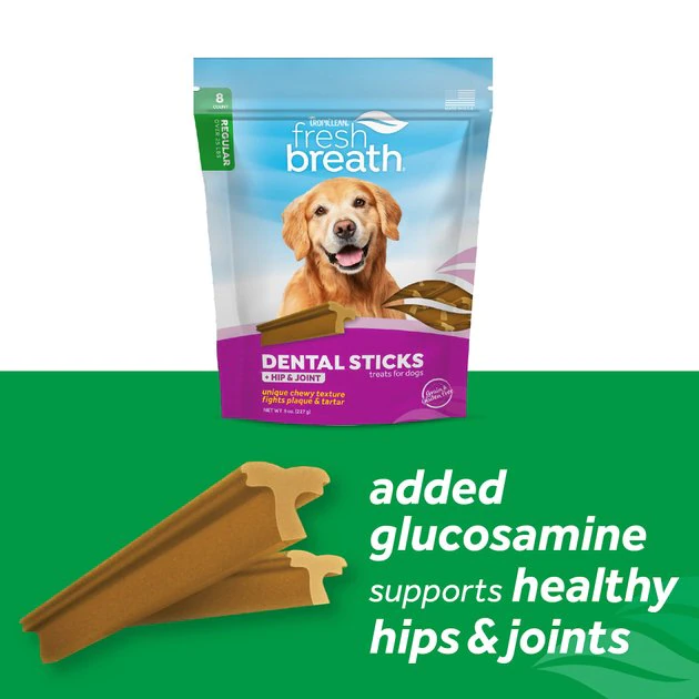 Say adios to doggy breath! Make your doggo’s dental care routine easier with TropiClean Fresh Breath Dental Sticks Plus Hip & Joint Dog Teeth Cleaning Treat. Simply treat your canine companion to one made-in-the-USA dental stick each day for cleaner teeth and a healthier mouth! These easy-to-digest, grain-free and gluten-free treats feature a chewy texture that helps brush away plaque and tartar—and freshen breath—while your buddy chews. The unique, T-shaped design has ridges that reach more surfaces of the teeth, helping simulate brushing with each chomp. What’s more, these multi-tasking dental snacks are made with added glucosamine to help support your sidekick’s healthy hips and joints.