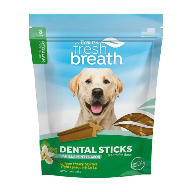 Support your canine companion’s oral health with TropiClean Fresh Breath Regular Advanced Dental Dog Sticks. These easily digestible, grain-free and gluten-free chews are crafted with natural ingredients like coconut and green tea and feature a fresh vanilla mint flavor to promote fresh breath. While your dog munches on the scrumptious stick, the chewy texture and unique T-shape help remove plaque and tartar! Give your BFF one TropiClean chew a day to encourage healthy teeth, gums and fresher breath. Now, you’ll be able to enjoy all your dog’s kisses without the stink!