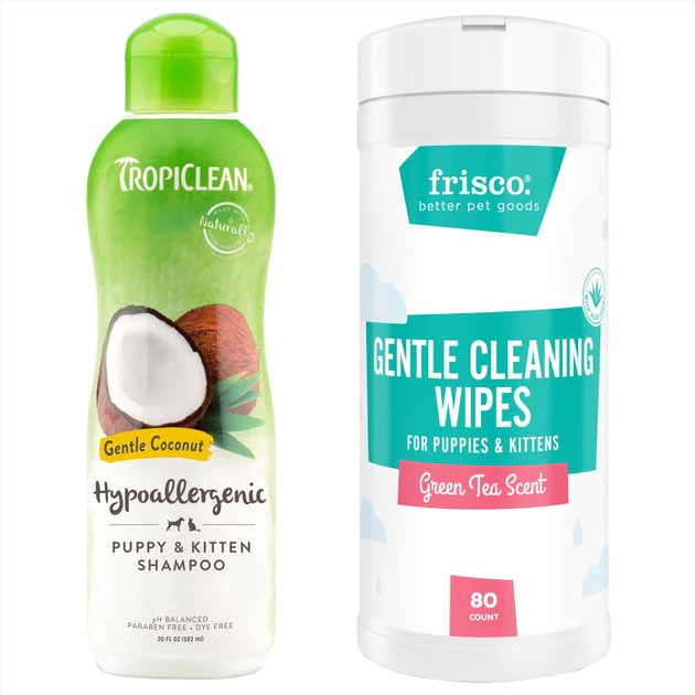 - TropiClean Hypo-Allergenic Gentle Coconut Puppy & Kitten Shampoo, 20-oz bottle—Gently moisturizes and softens.