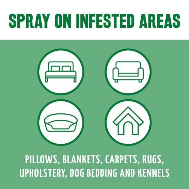 Shake well. Lightly spray dog’s entire coat including legs, tail, and stomach. Do not spray in the face, eyes or genitals. Cover the entire coat until damp, but not dripping. Stroke the animals’ coat against the lay while spraying until the solution reaches the skin. Repeat as necessary. In order to help reduce the occurrence of fleas and ticks, this product is best used year-round intervals. Spray on dog bedding and other areas that may be infested. Safe for use indoors or outdoors.