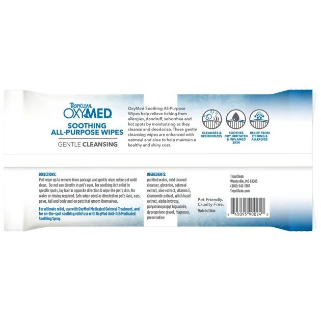 Pull wipe up to remove from package and gently wipe entire pet until clean. Do not use directly in pet’s eyes. For soothing itch relief in specific spots, lay hair in opposite direction & wipe the pet’s skin. No water or rinsing required. Safe when used as directed on pet’s face, ears, paws, tail and body and on pets that groom themselves. For ultimate relief, use with OxyMed Medicated Oatmeal Treatment, and for on-the-spot soothing relief use with OxyMed Anti-itch Medicated Soothing Spray.