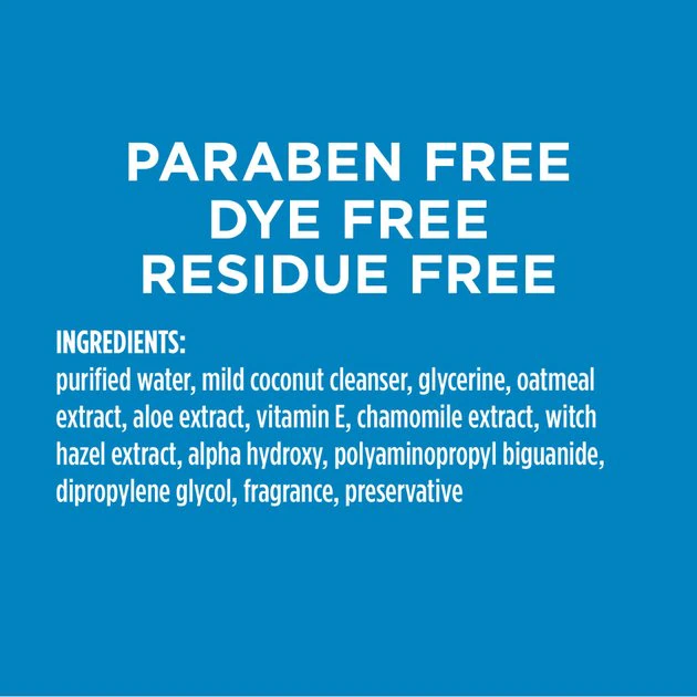 Purified Water, Mild Coconut Cleanser, Glycerine, Oatmeal Extract, Aloe Extract, Vitamin E, Chamomile Extract, Witch Hazel Extract, Alpha Hydroxy, Polyaminopropyl Biguanide, Dipropylene Glycol, Fragrance, Preservative.