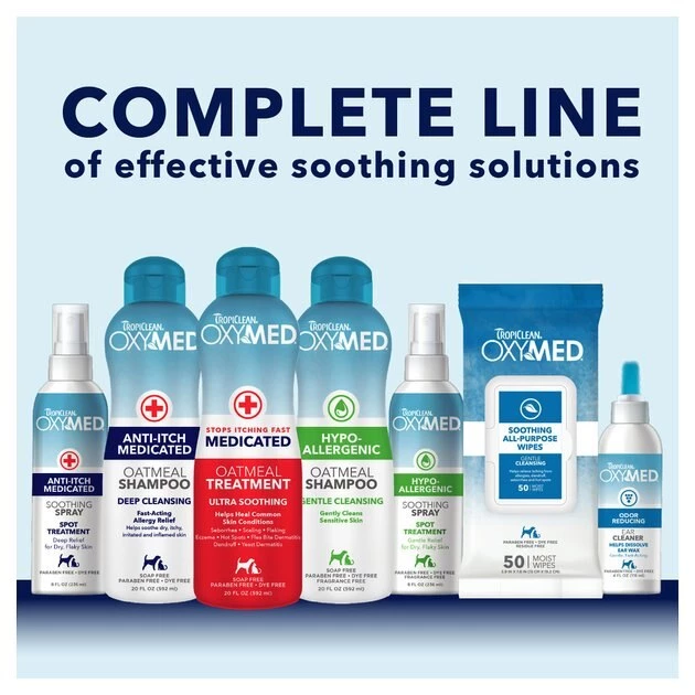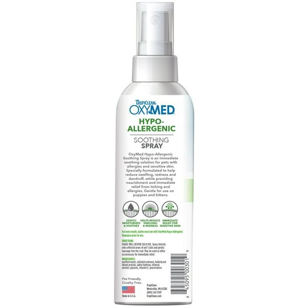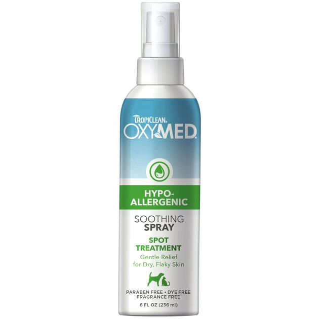 Help your sensitive sidekick feel her best with TropiClean OxyMed Hypoallergenic Soothing Spot Treatment Dog and Cat Spray. This hypoallergenic formula is made in the USA with zero parabens, dyes or fragrances, making it paw-fect for pets with allergies and sensitive skin. The soothing and mild solution is designed to provide gentle relief from dry, flaky skin and help reduce redness, swelling and dandruff. Itβs suitable for dogs and cats and gentle enough for puppies and kittens!