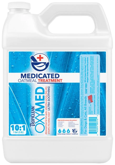 Help soothe your pet’s skin with TropiClean’s OxyMed Medicated Oatmeal Dog & Cat Treatment. This medicated rinse is formulated to stop itching, control flaking and reduce shedding, so your sidekick can get the relief she needs. OxyMed contains alpha-hydroxys, which penetrate the lowermost levels of the skin, “clean out” the pores and help relieve skin problems like seborrhea, which causes red, itchy, dry skin. It is also packed with vitamins and omega 3 fatty acids to further nourish your pet’s skin and coat, so she can start to feel more like herself again.