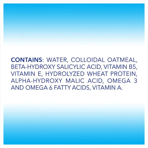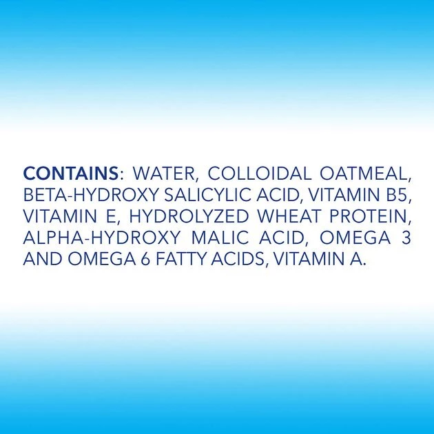 Purified Water, Conditioner Blend, Colloidal Oatmeal, Propylene Glycol, Beta Hydroxy, Alpha Hydroxy, Hydrolyzed Wheat Protein, Vitamin E, Vitamin B5, Omega 3, Omega 6, Vitamin A, Aloe, Chamomile, Fragrance, Preservative