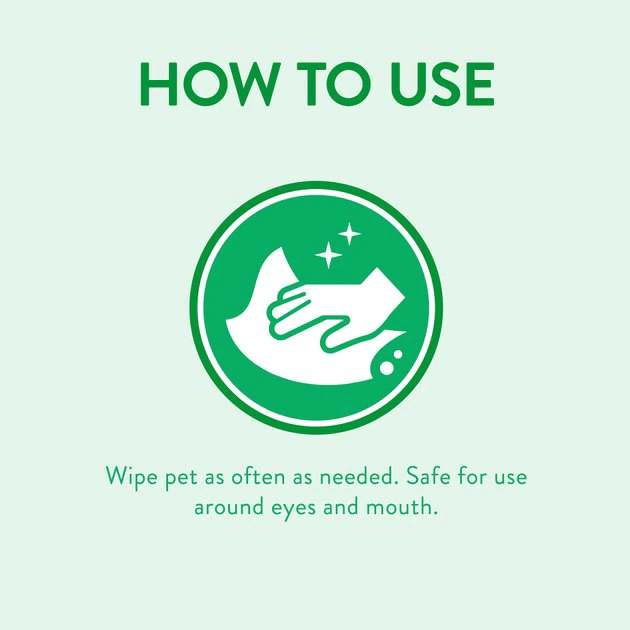 Pull wipe up to remove from package and gently wipe entry pet until clean. Do not use directly in pet’s eyes. Safe when used as directed on pet’s face, ears, paws, tail and body and on pets that groom themselves. Gentle for everyday use.