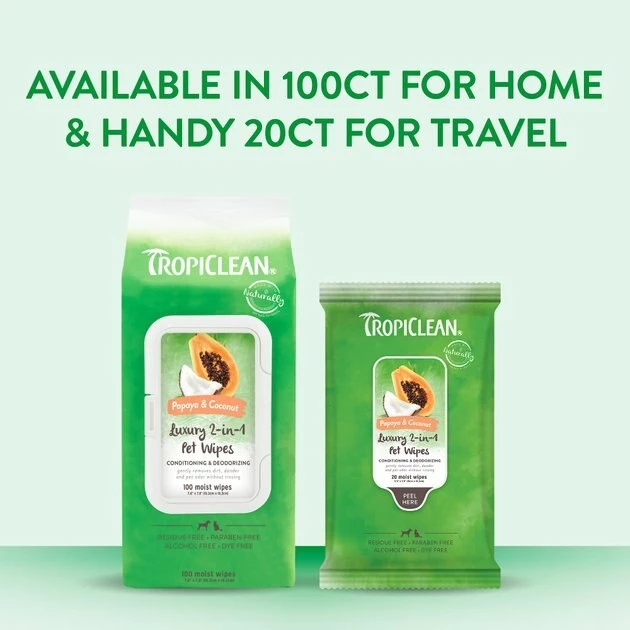 With the TropiClean Papaya & Coconut Luxury 2-in-1 Pet Wipes, it’s su-paw easy to keep your best friend looking and feeling fur-esh! These wipes wash away dirt, dander and stinky odors for a quick cleanup in between baths. The mild coconut cleanser is safe for use on furbaby paws, faces, bodies and butts, so they’re fresh and ready for cuddles. The cleanser is made with 98.5% naturally derived ingredients including aloe and witch hazel extracts, so it’s paw-fect for both cats and dogs. Since the cleanser is free of parabens, alcohol, soaps and dyes, you don’t have to worry about harsh chemicals and other bad stuff washing away spot-on flea treatments. These wipes are ideal for on-the-go use after a trip to the dog park, a hike in the woods, or a swim at the beach. The packaging is even made of recyclable materials—so you can feel good about choosing these wipes.