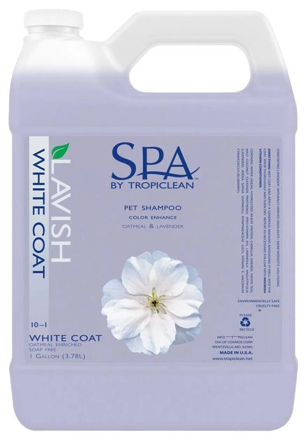 Keep your pet’s snowy coat looking bright and beautiful with SPA by TropiClean White Coat Shampoo for Pets. This rich lathering shampoo gently removes dulling build-up and residues that can make white coats look dingy or faded, while bringing out a bright shine for maximum impact. It refreshes and perfects colors to create a beautiful radiant glow, intensifying highlights and amplifying shine without adding or depositing color. The oatmeal-enriched, soap-free formula contains no bleach, peroxide, ammonia, or alcohol and is safe when used as directed on dogs and cats 12 weeks and older. Use this luxuriously lavender-scented shampoo to brighten your pet’s white coat and bring out his natural shine and beauty!