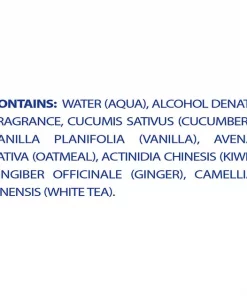 Water (Aqua), Avena Sativa (oatmeal), Actinida Chinesis (Kiwi), Hydrolyzed Wheat Protein, Cucumis Sativus (Cucumber), Mild Coconut Cleanser, Lavndula Angustifolia (Lavender), Zingiber Officinale (Ginger), Vitamin E, Panthenol (Pro-Vitamin B5).